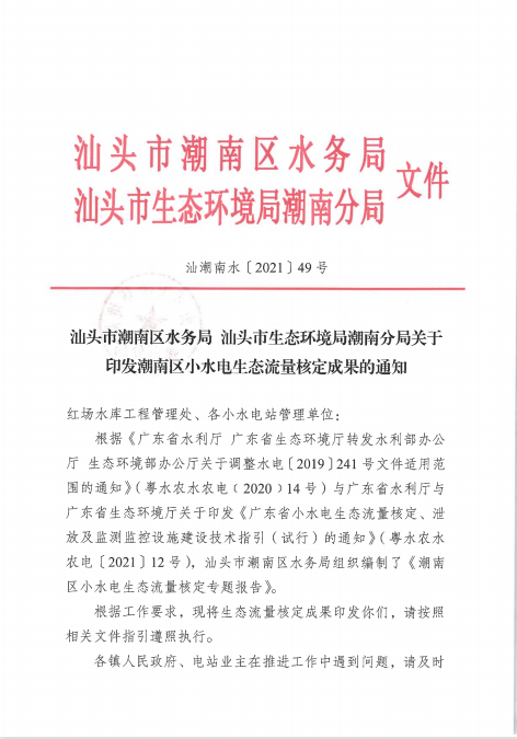 汕头市best365官网登录_365bet官网备用网站_365bet提款问题水务局 汕头市生态环境局潮南分局关于印发best365官网登录_365bet官网备用网站_365bet提款问题小水电生态流量核定成果的通知